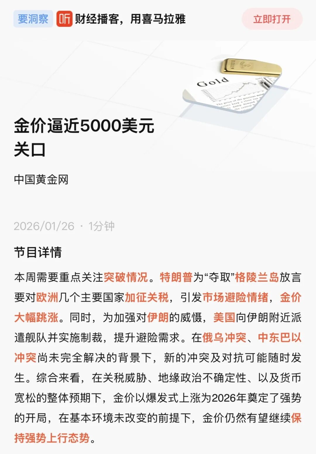 欧盟对美国的警惕态度、北欧养老基金抛售美债为国际金价提供支撑,特朗普声称将获得格陵兰岛全面准入权。高盛将今年国际金价预期上调至5400美元/盎司,国际金价连续发力,强势突破4900美元/盎司、5000美元/盎司、5100美元/盎司三大关口,本月累计涨幅已超15%。